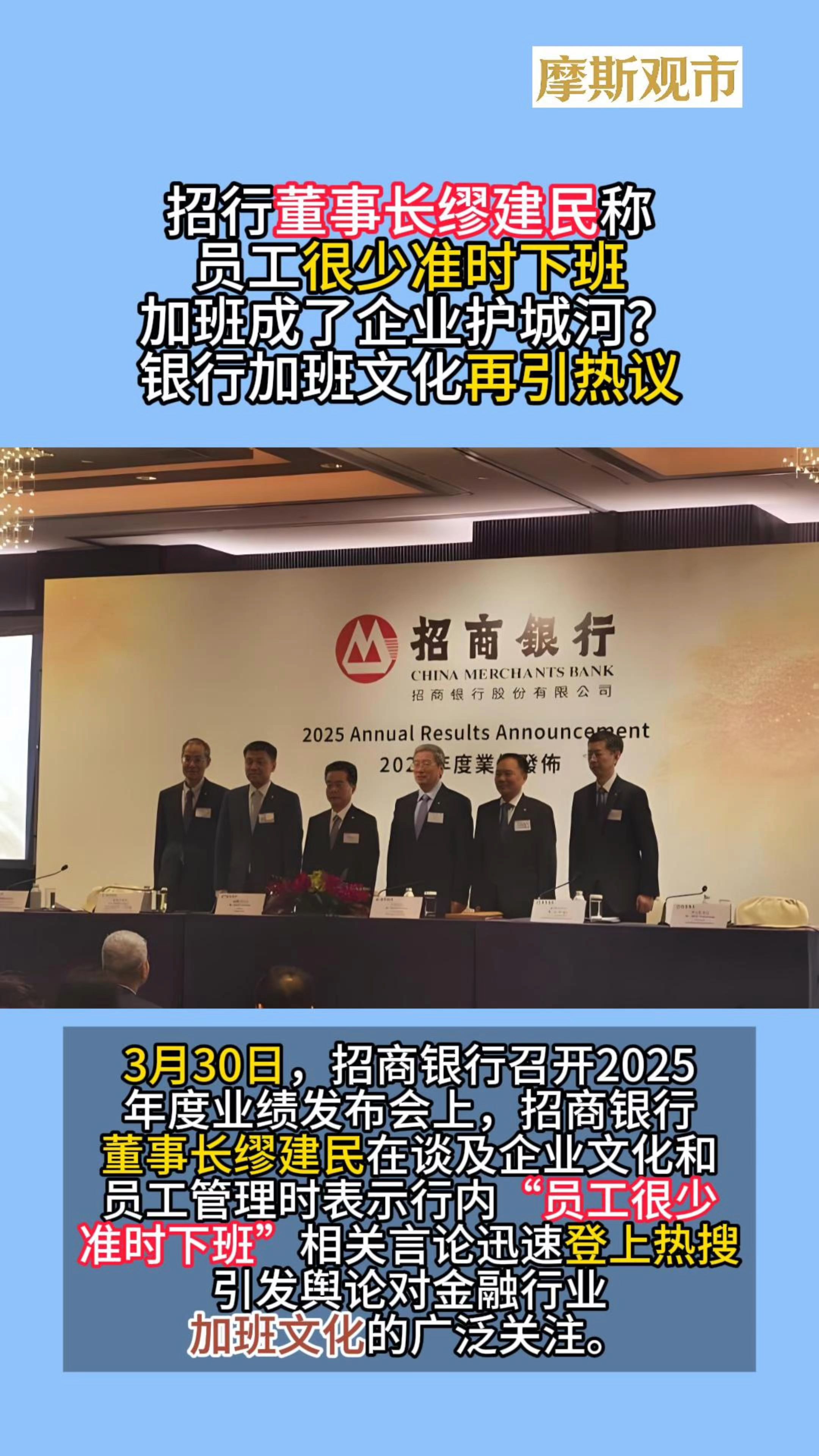 招商银行董事长缪建民“员工很少准时下班”上热搜!银行加班文化再引热议