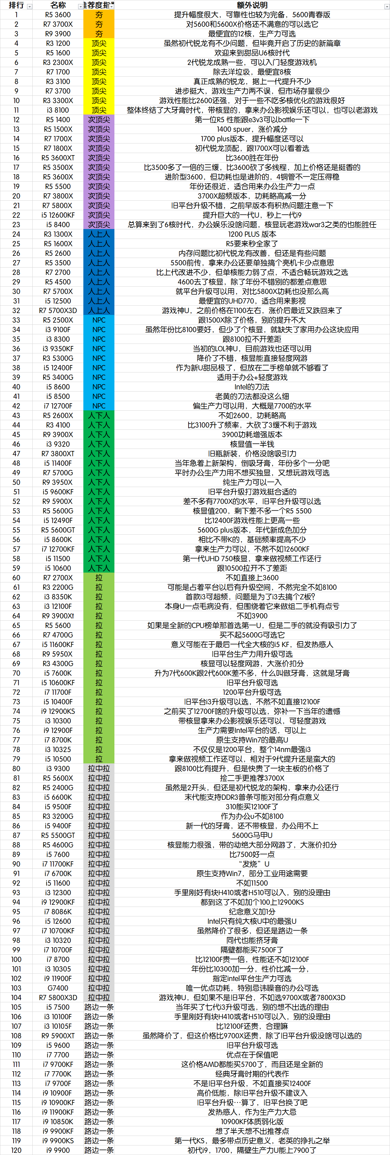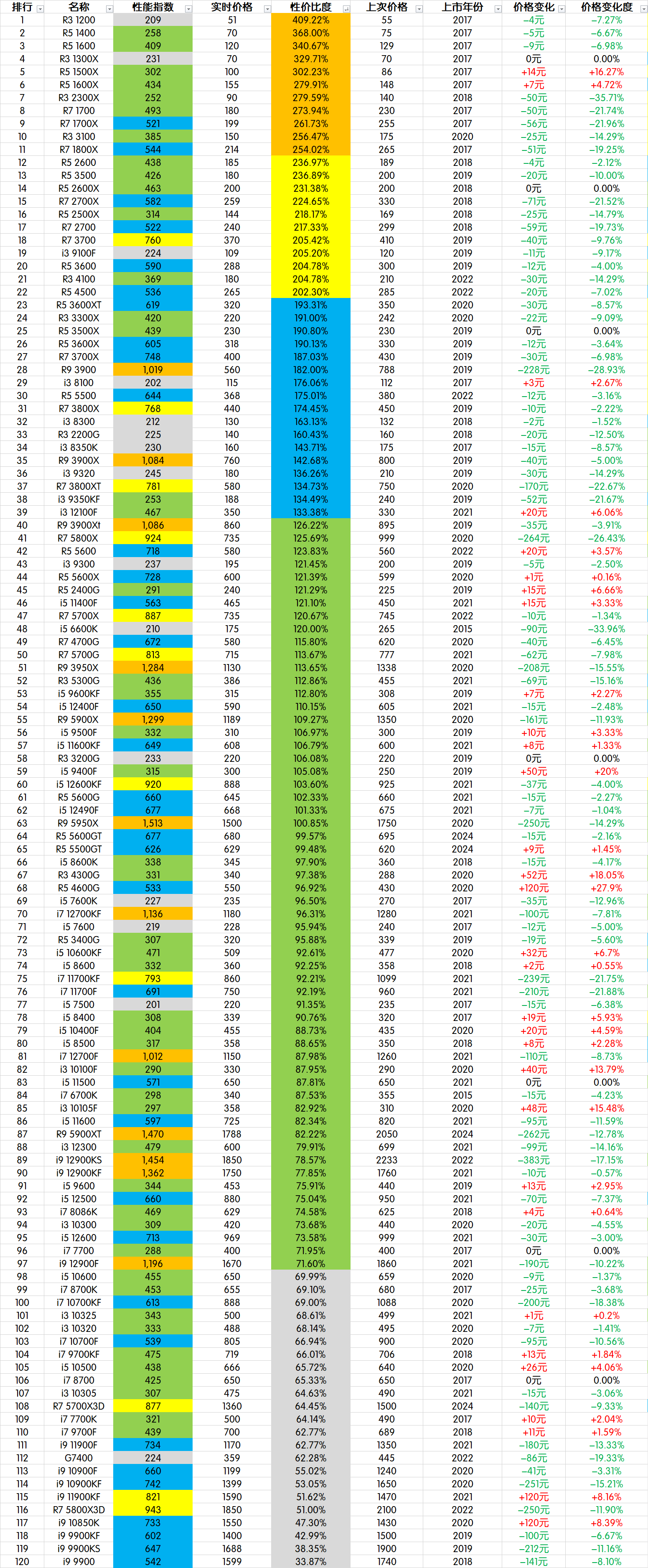 更新变化:与上次相比,新增加了酷睿12代以及3代锐龙所有CPU。统计范围说明:范围为主流上市十年以内的CPU,太久远的就不统计了,另外性能太弱到没啥采购价值的也不统计了,由于intel E5洋垃圾系列