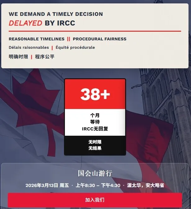 本周五,来自加拿大多地的华人申请人计划前往渥太华国会山集会发声,呼吁政府尽快解决永久居民申请长期拖延的问题。集会时间:3月13日周五,上午8:30-下午4:30地点:安省渥太华国会山组织者在发布的《公