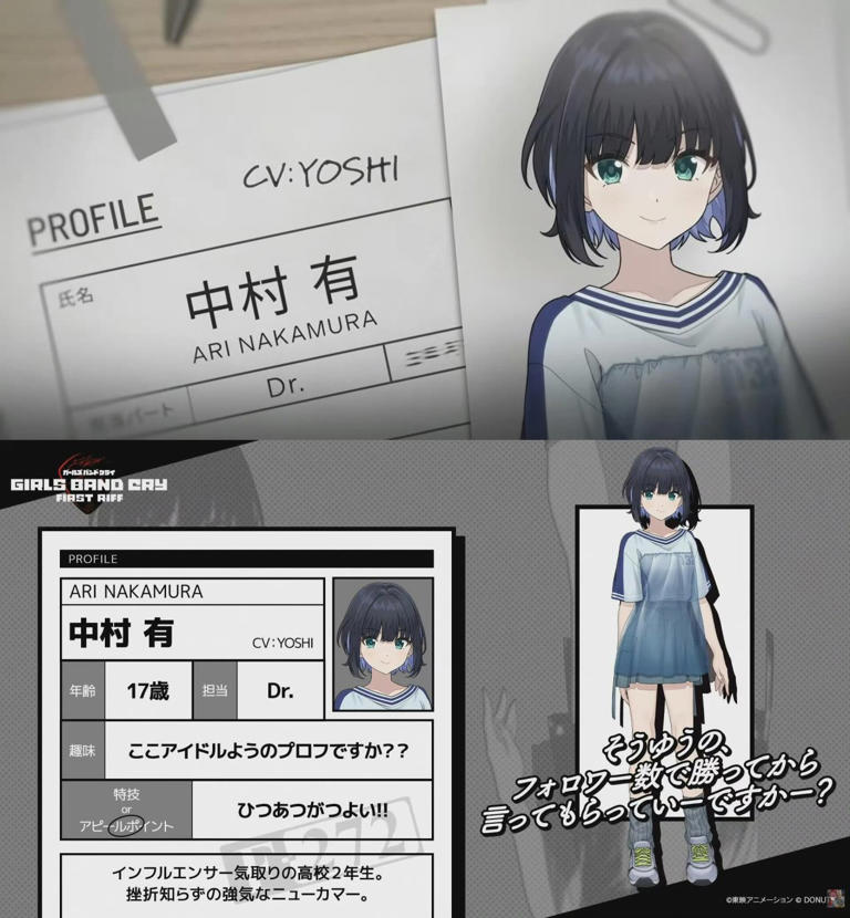 近日,GIRLS BAND CRY企划公布了新乐队「F-272」的基本信息!以下是成员的基本信息中村有 CV:YOSHI年龄:17岁位置:鼓手爱好:这简历怎么写得跟偶像似的?特长:打鼓爆发力极强简介: